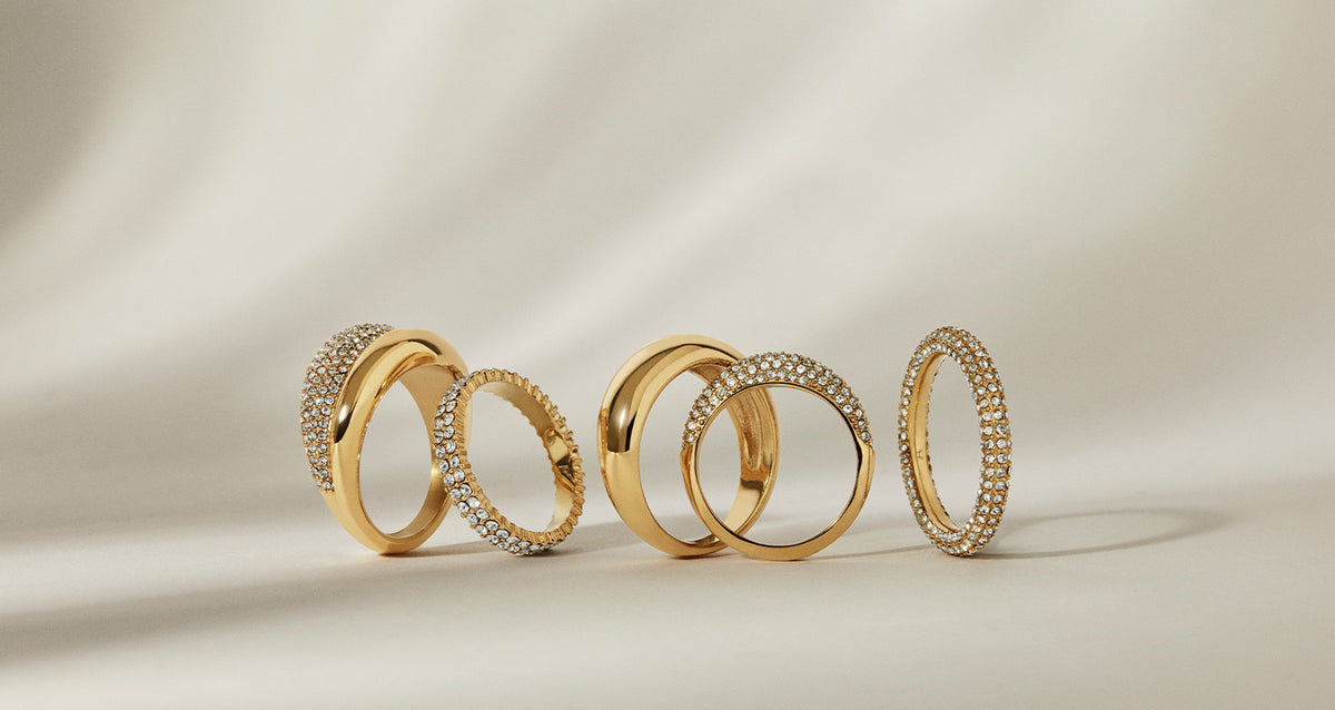 Dekorerte ringer i fargene gull og sølv. En kombinasjon av klassisk eleganse og uttrykksfulle detaljer.