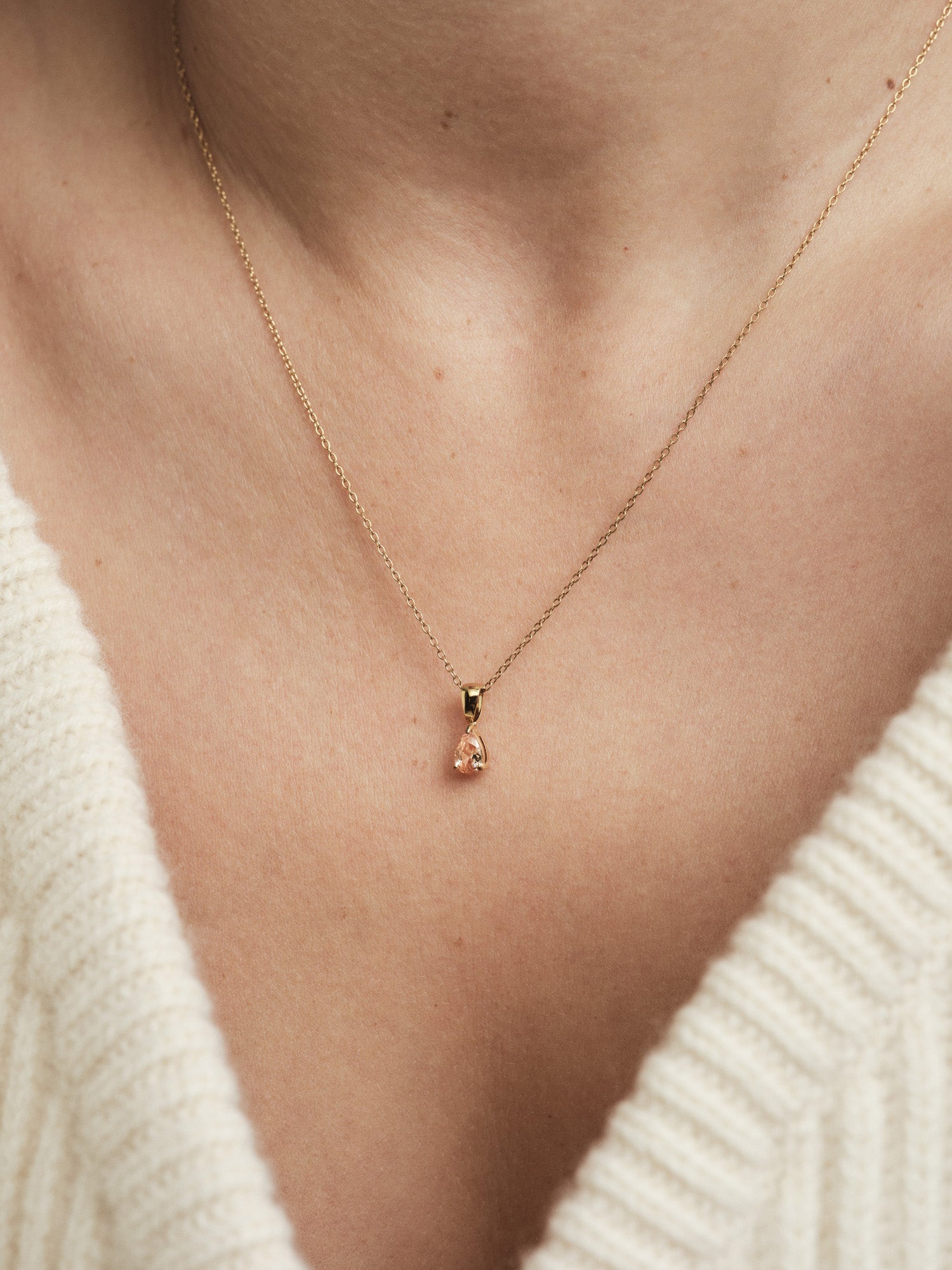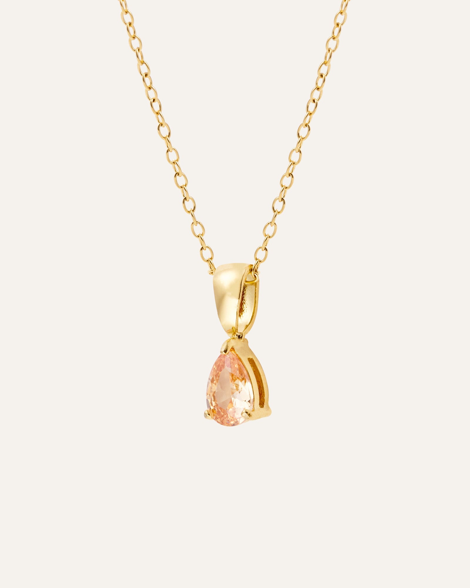 Belle Champagne Necklace er et minimalistisk smykke med en dråpeformet champagnefarget stein festet til en tynn lenke. Laget av rustfritt stål med 18K gullfarget PVD-belegg – slitesterkt og vannavstøtende, slik at det beholder sin farge og glans over tid.