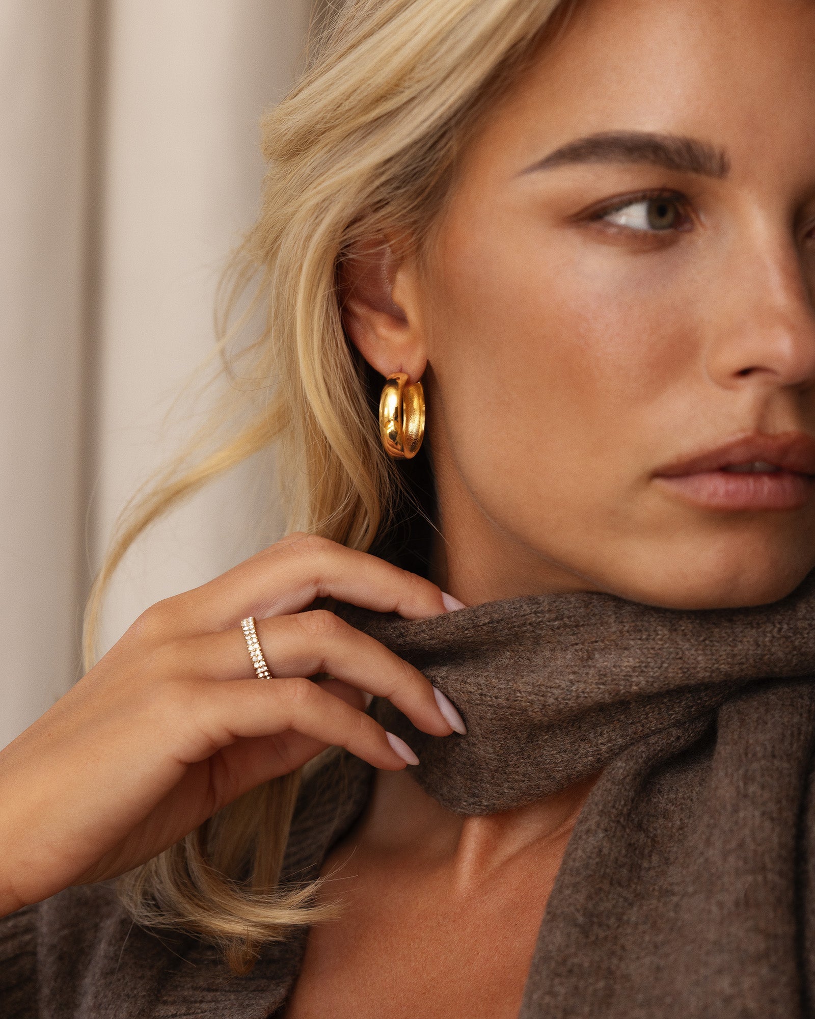 Brave Large Hoops in a gold-tone finish feature a softly domed, compact design that sits close to the ear. Made from stainless steel plated with 18K gold using PVD technology, they retain their shine with daily wear. Wear them solo for a clean look or pair with smaller studs for a personal touch.