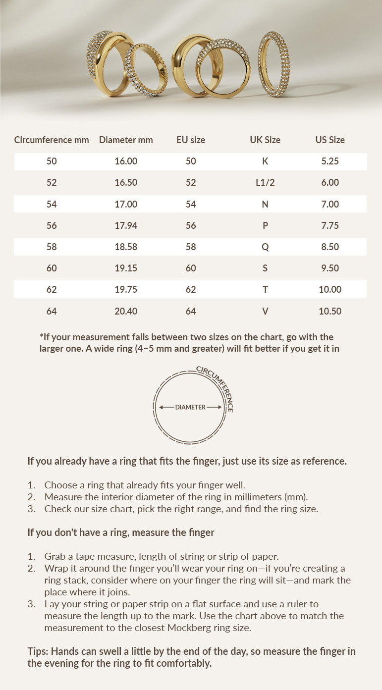 Tip: Fingers can swell slightly in the evening, so measure your finger at night to ensure a comfortable fit.