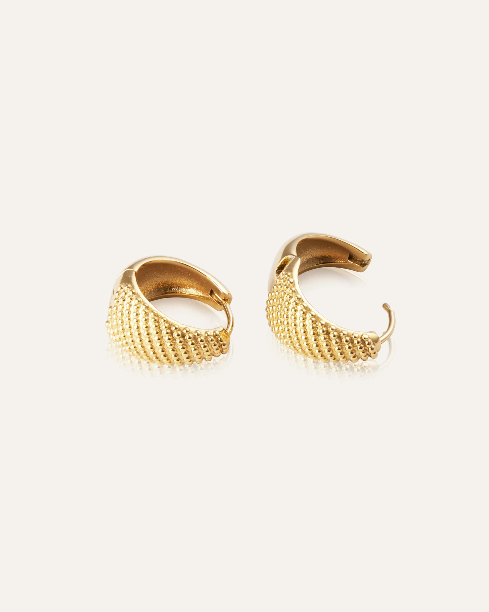 Honey Hoops har et unikt design med en strukturert overflate som skiller dem fra de klassiske Bold Hoops. Laget av massivt rustfritt stål med 18K gullfarget PVD-belegg – både slitesterke og vannavstøtende.