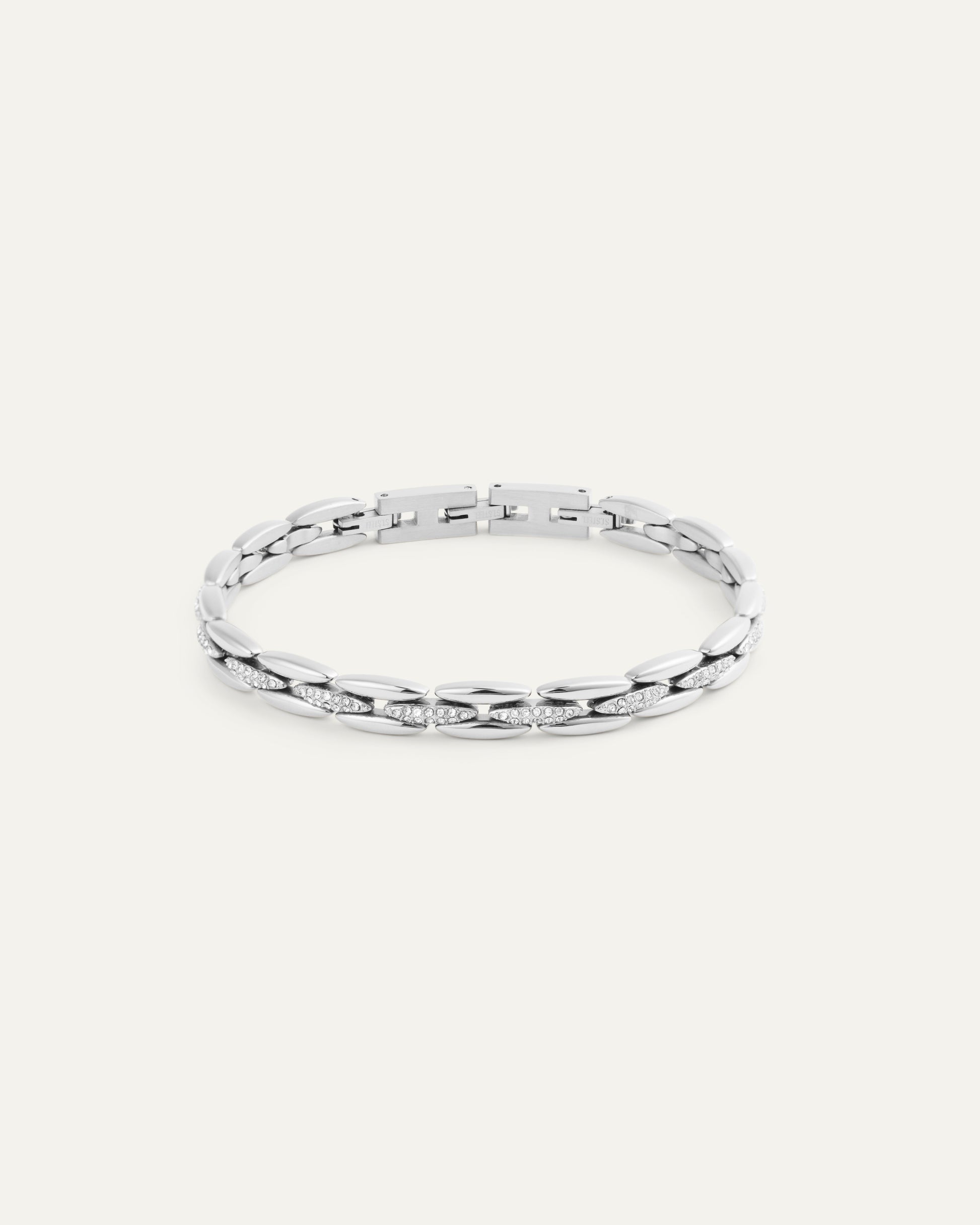Chain bracelet with soft, interlinked shapes where smooth sections meet pavé-set white Preciosa stones. The silver color gives a cool, refined look – just as beautiful on its own as paired with a watch. Adjustable fit with extra length for all-day comfort.