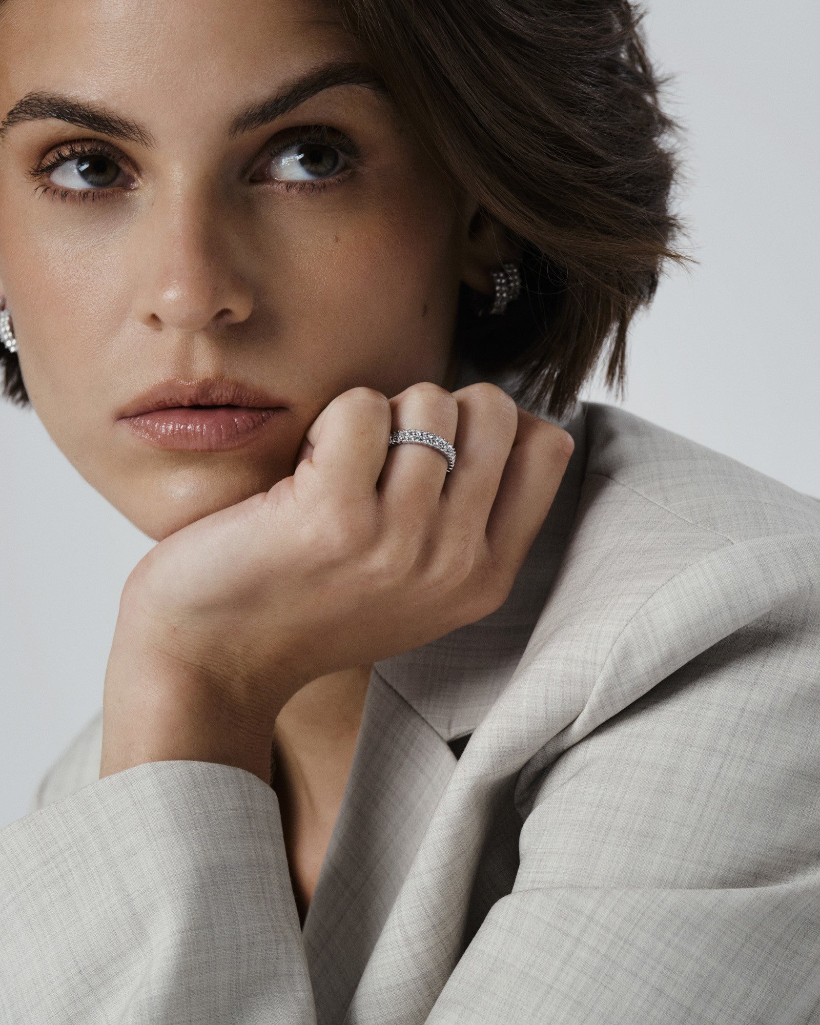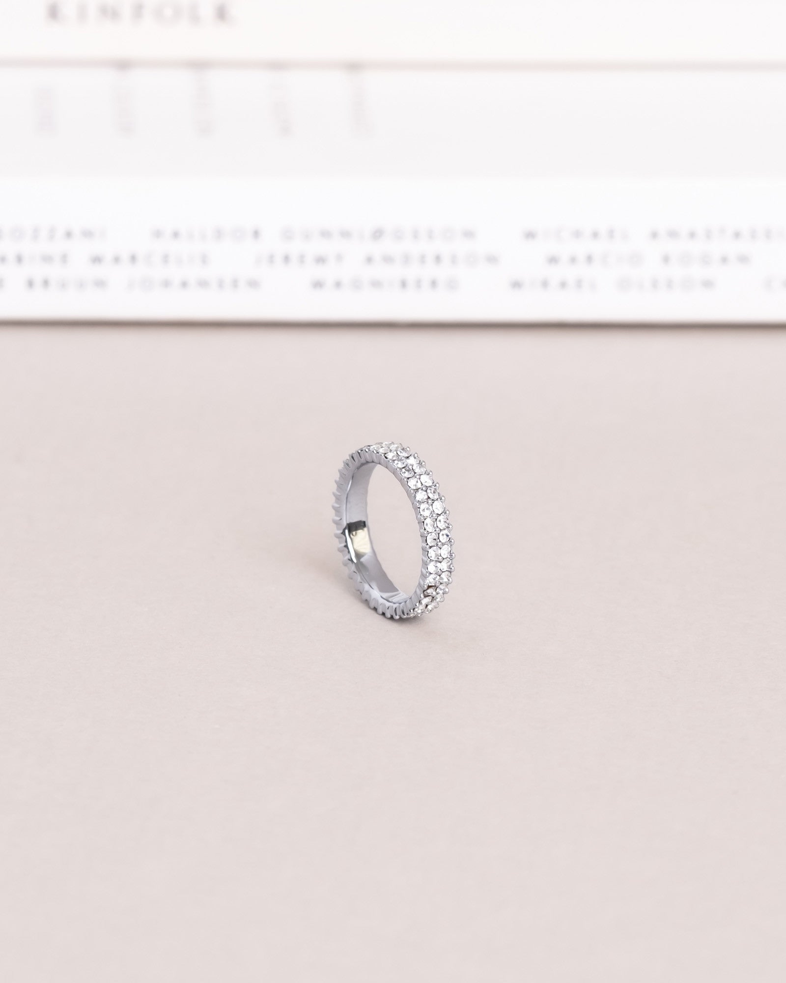 Klassisk ring dekket med små glitrende hvite kubiske zirkonia-steiner. Laget av messing med sølvfarget PVD-belegg – vannavstøtende og slitesterk. Bruk den hver dag – svøm, dusj og tren uten å bekymre deg for at fargen falmer.