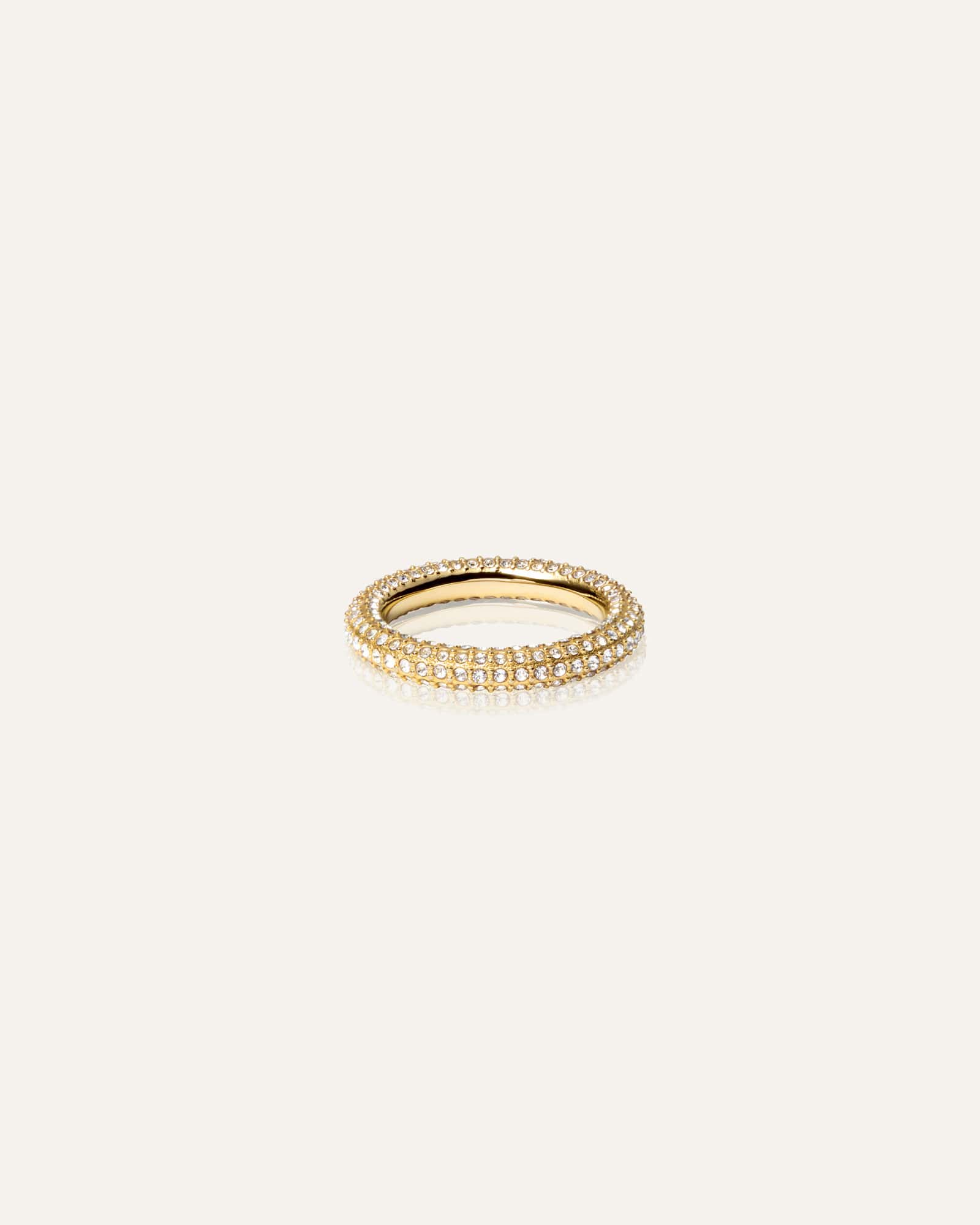Pavé Eternal Ring har et elegant og smalt design, fullt dekorert med glitrende hvite kubiske zirkonia-steiner. Laget av massivt rustfritt stål med slitesterkt 18K gullfarget PVD-belegg – vannavstøtende og holdbar. Bruk den hver dag – svøm, dusj og tren uten bekymring for at fargen falmer.