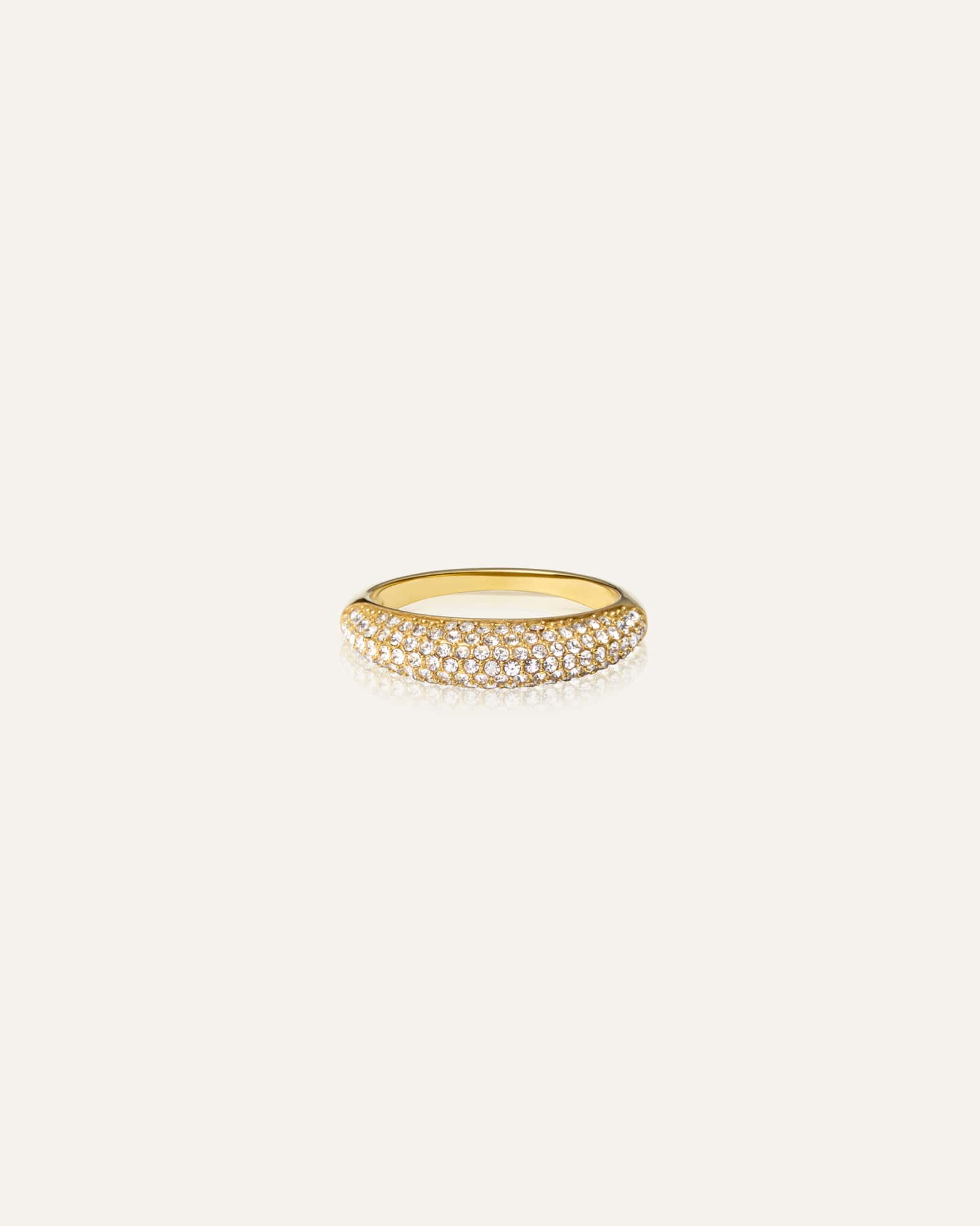 En elegant ring med avrundet design, der toppen er dekorert med små kubiske zirkonia-steiner og undersiden er glatt. Laget av massivt rustfritt stål med 18K gullfarget PVD-belegg – vannavstøtende og slitesterk. Bruk den hver dag – svøm, dusj og tren uten bekymring for at fargen falmer.