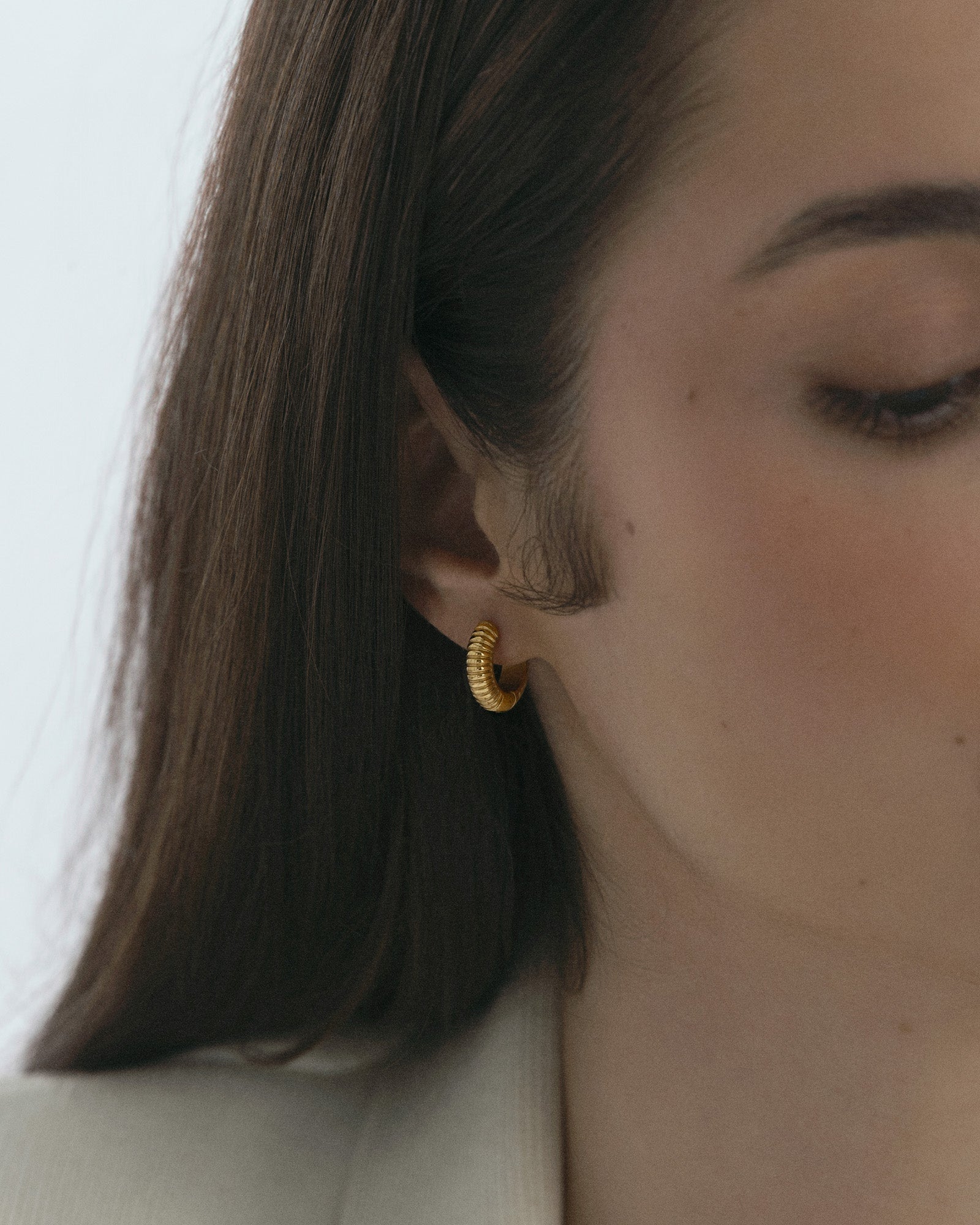 Ribbed Hoops har et unikt design med riflet tekstur som skiller dem fra de klassiske Everyday Hoops. Laget av massivt rustfritt stål med 18K gullfarget PVD-belegg – slitesterke og vannavstøtende, og bevarer både farge og stil over tid.