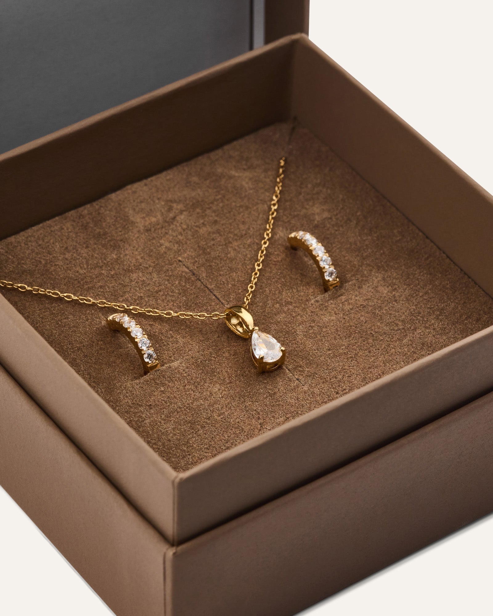 Et stilrent sett med halskjede og våre bestselgende øredobber. Designet for å skape et tidløst, klassisk uttrykk. Den perfekte gaven til noen du er glad i – eller til deg selv.