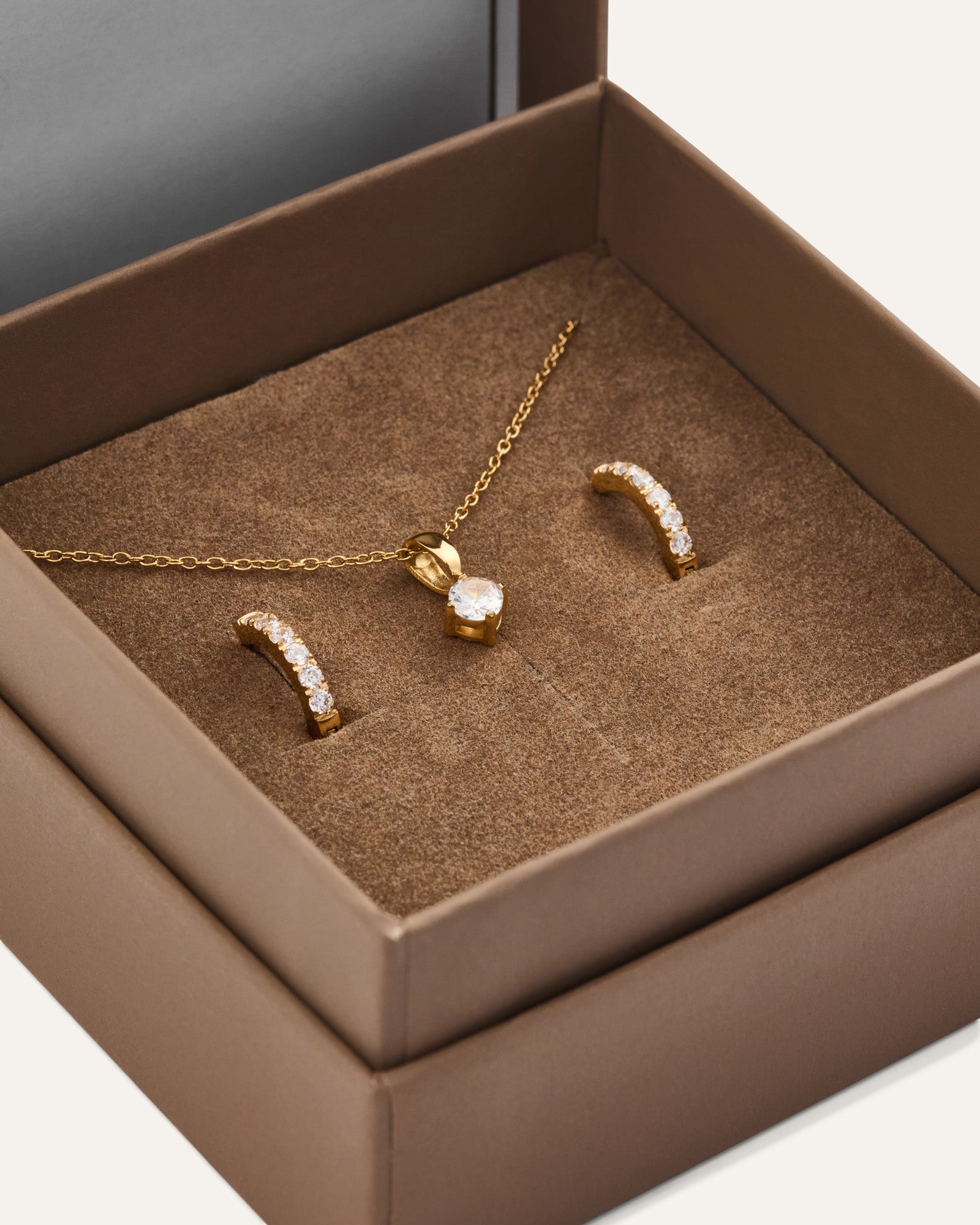 Et stilrent sett med et halskjede og våre bestselgende øredobber. Designet for å skape et tidløst og klassisk uttrykk. Den perfekte gaven til en du er glad i – eller til deg selv.