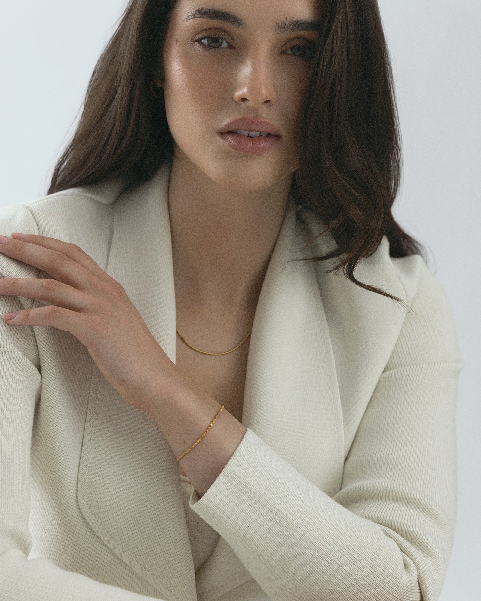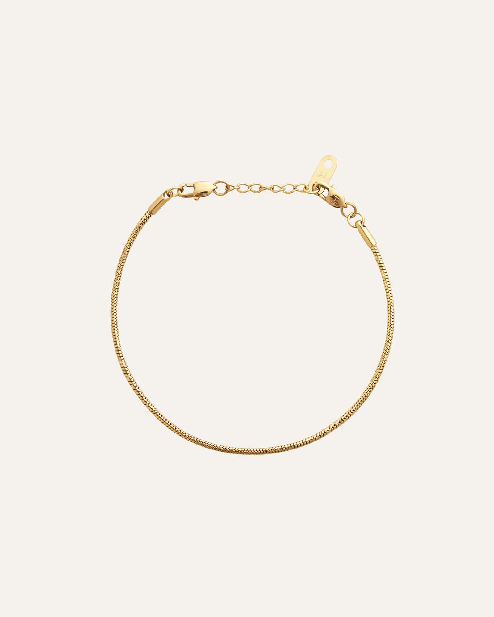 Et klassisk armbånd med mykt flytende design. Laget av rustfritt stål med 18K gullfarget PVD-belegg – slitesterkt og vannavstøtende, og bevarer både farge og glans over tid. Forlengelseskjeden kan enkelt fjernes for en tilpasset passform.