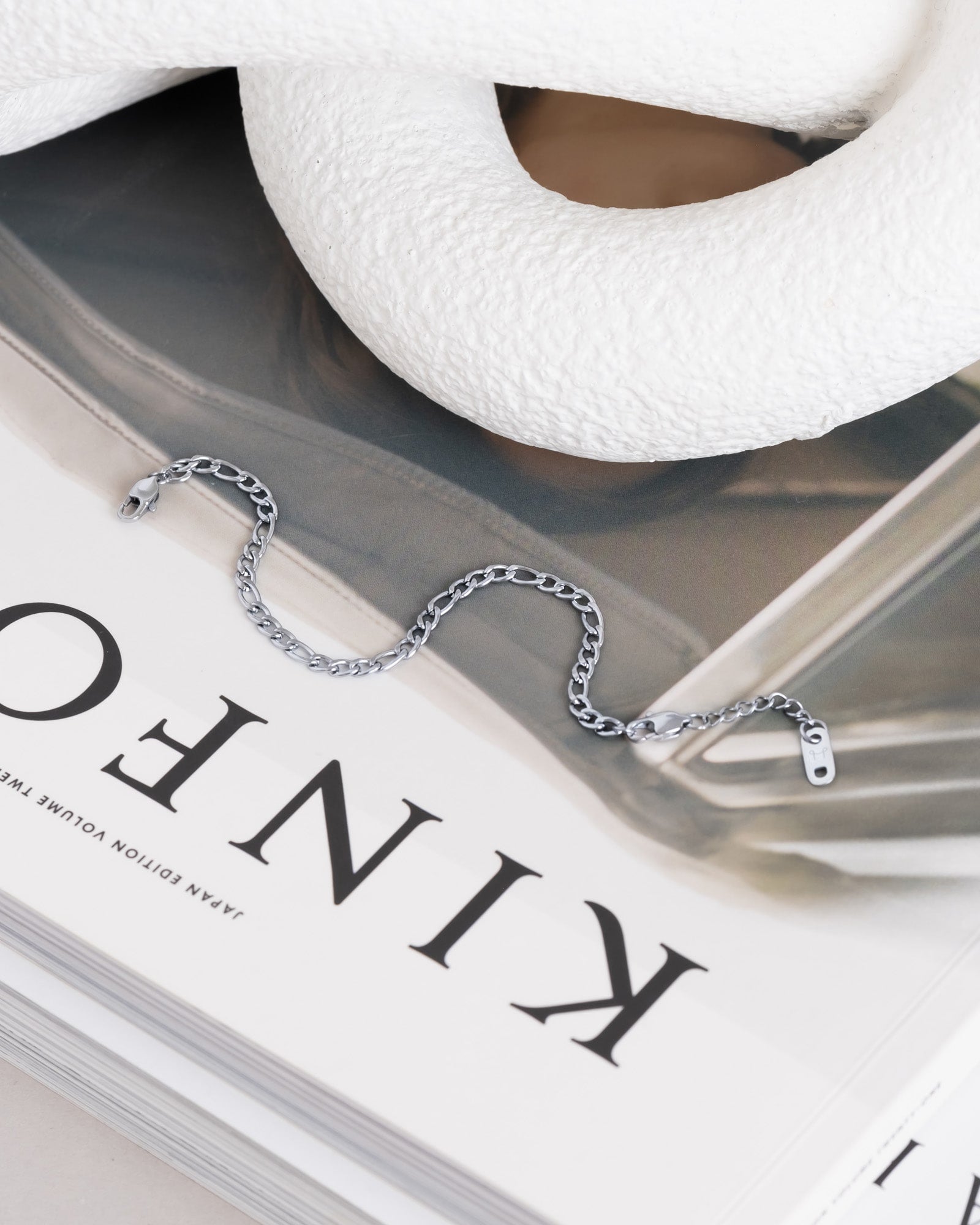Figaro Bracelet er et armbånd med klassisk lenkedesign, perfekt til alle anledninger. Bruk det alene eller sammen med Figaro Necklace for en helhetlig stil. Laget av rustfritt stål med PVD-belegg – slitesterkt og vannavstøtende, og bevarer både farge og glans over tid. Forlengelseskjeden kan enkelt fjernes for tilpasset passform.